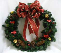 The bow traditionally goes at the top of the wreath, but it can also go at the bottom, or at an angle--4 O’clock or 8 O’clock positions, (if the wreath were a clock.) Some wreaths do not have a bow at all, such as a pine cone wreath.