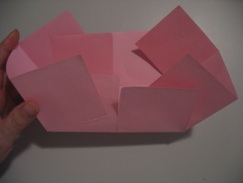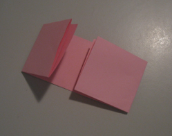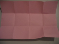 12. If you plan to mail these cubes, fold them flat first: Starting with the cube opened all the way out--as a flat sheet of paper. Repeat steps 1-3--fold the side flaps onto the middle third, then fold the two ends to the middle, then fold it in half one more time (Fold on the folded lines--don’t make any new folds!!) Be sure to write instructions for how to form a cube, or your recipient won’t have any idea what you have sent!