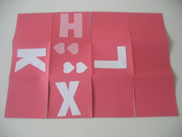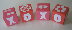 11. Make as many cubes as you want--the ones pictured here spell the word “love” on one side, and “hugs” “kiss” and “XOXO,” (which stands for hugs and kisses) on the other sides. If you want to go crazy, make enough cubes to spell “Happy Valentine’s Day !”