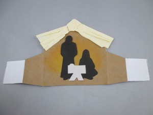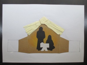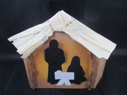 5.Cut Mary and Joseph figures out of black paper. Glue these figures to the stable, or use foam-style double stick tape to make them stand out from the background.