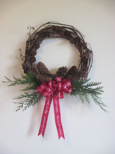 On the vine wreath above, there are 2 kinds of large cones just above the bow, and 2 or 3 kinds of small cones glued to the wreath itself. Large pinecones are quite heavy, so they need to be fastened on with florist’s wire. This is sold at crafts stores, Walmart, and some dollar stores.