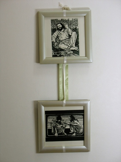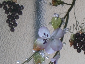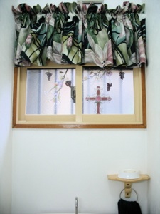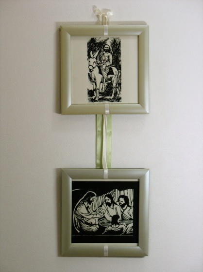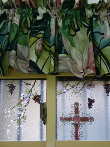 These decorations were inspired by elements of the last supper. The bead flowers,( purchased at 100 yen stores), are combined with clusters of grapes (made from 100 yen store beads and wire). The cross is made of colored glass so that it glows in the sunlight. Any glass suncatcher in the shape of a cross, or some other object for Jesus’ last week, such as grapes, make a good window decoration that won’t block the sunlight.