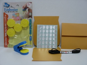 1.Emboss silver paper and cut out paper “coins” (shown in photo on far left) Both embosser and silver paper are sold at some hundred yen stores in the stationary section