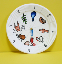 2.Cut out story circle and fasten it to the paper plate, and write corresponding numbers on the rim.