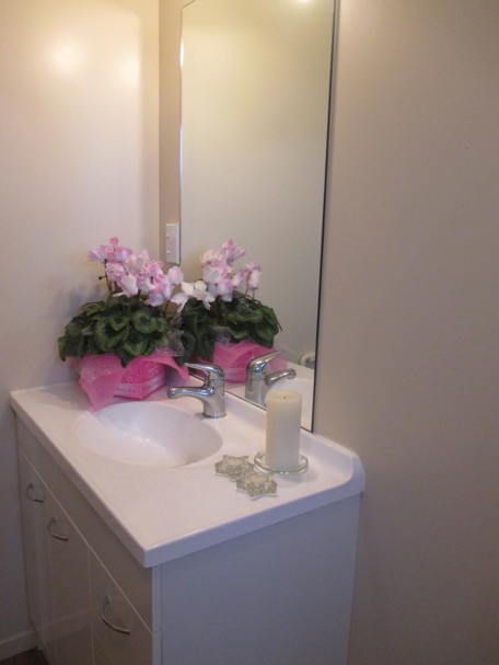 Even a small bathroom can be decorated for Christmas. The pink cyclamen sits in the corner next to the sink. Because of the mirror, the reflection gives the impression that there are two plants. The pink color gives a welcome change from the usual red around the rest of the house. The other corner near the sink is decorated with a white pillar candle and two star shaped tea light holders. If you really can’t afford the lost space, only decorate one corner. If you are used to having lots of toiletries and cosmetics on the counter, clean up the clutter just for the season. The decorations won’t look very nice with stuff sitting everywhere. Put everything in a basket under the sink. Then whenever you need anything, all you have to do is grab the basket from under the sink, and it is ready to use.