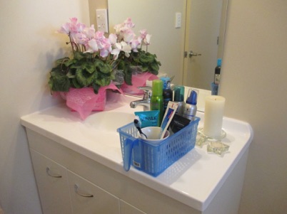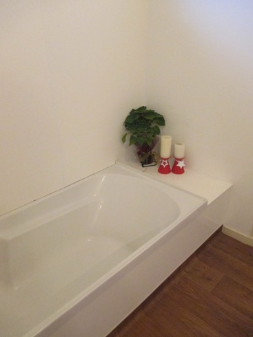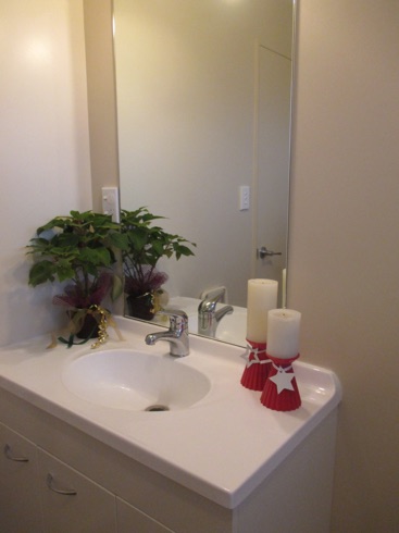 Here is the same bathroom with a red and green color theme this time. Again, a potted plant and some candles are used. It takes less than 5 minutes to plop down some candles and plants. Of course, if things are a mess, it may take some time to get all that clutter cleared away, but still easily accessible.