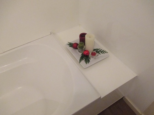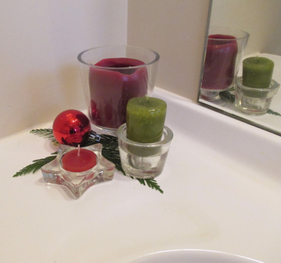 It doesn’t take much to add some Christmas cheer to every corner of the house. Here the bathroom sink is decorated with one pillar candle, one votive candle and one tea light. Between the candles put a little greenery and a Christmas ball. It only takes a minute to put them in the corner. Dollar stores sell pillar candles, votive candles and tea lights, so it doesn’t have to cost a lot of money. The bathtub can be decorated in the same way--there is more space, so the arrangement can be a little bigger. It is on a plate for easy clean-up.
