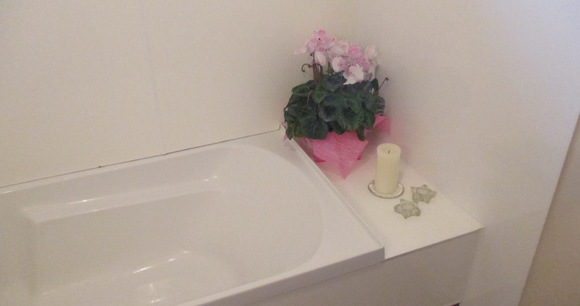 If you have a small ledge next to the bath, it is the perfect place for more decorations. Repeat the same decorations that are on the sink, or use different objects in the same color scheme. If the plant is in a dark corner, set it in the sun every few days to keep it healthy. If you have a wide window ledge, that would be an even better place to decorate with a plant. If you have a window, but no ledge, you could hang it from the ceiling in front of the window.
