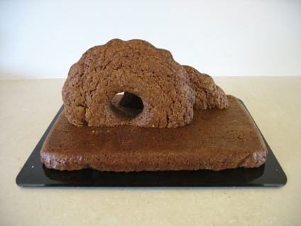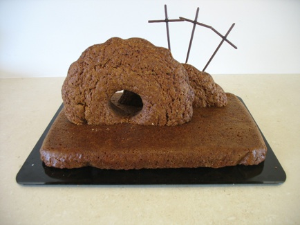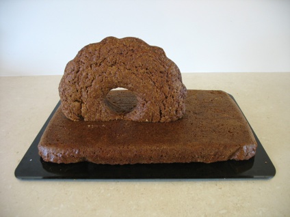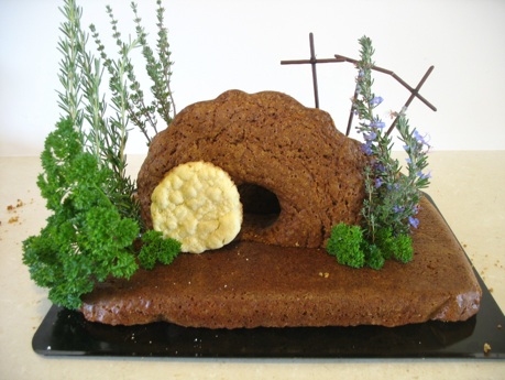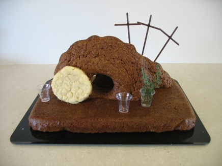 Make the “empty grave” part of the cake in a plain tube pan, or as in this photo, a fluted tube pan (bundt pan). If you don’t have a tube pan, you can experiment with putting an ovenproof glass (such as a ramekin, or small measuring cup) in the middle of a round cake pan before filling the pan with batter--make sure the glass is well greased! Some batter may seep under the cup during baking, but if you carefully remove the cup, then cut excess cake away, it should be fine.