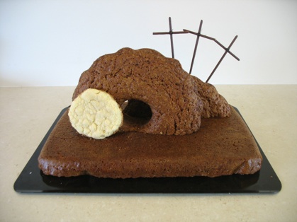 Put the smaller portion behind the grave to close off the back, but make sure it sticks out to one side of the grave because this smaller hill becomes Calvary hill in the background. If you want to ice the cake, this is a good time to do that. If you prefer the cake to be less sweet, leave off the icing, and it will look like dirt and rocks--just right!