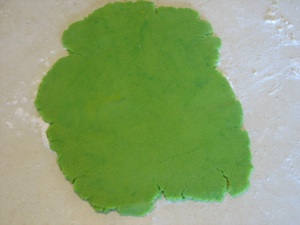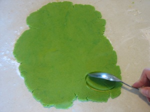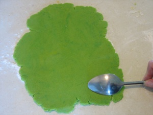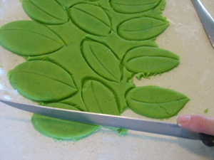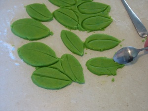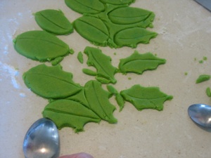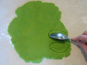 Roll out dough about 1/4 inch thick (1/2 cm) Cut the leaves by rolling a tablespoon along one side, then on the other side. Each leaf will turn out a little different--some will be big, others will end up small or narrow. That is fine since that is the way real leaves grow!