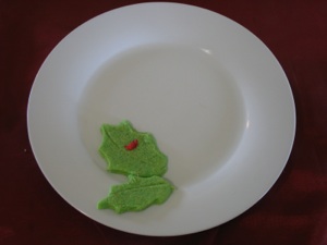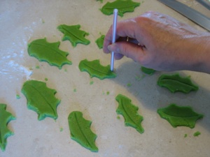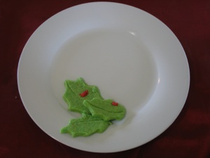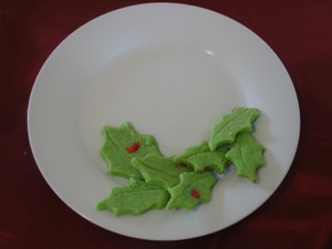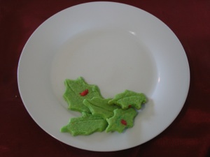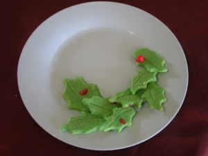Make holly berries with icing or use red candy such as m and m’s. Color some icing with red food coloring and put into a plastic bag. Cut a tiny hole in one corner, and twist the rest of the bag above the icing to keep it from squeezing out the open end. Squeeze some red berries onto the leaves.