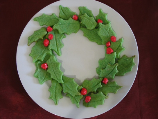 Impress everyone with a holly wreath you can eat! You don’t have to have a holly leaf cookie cutter to make these leaves--just use spoons to cut the leaves, and shape the scalloped edges.