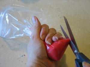 Alternative: leave the red icing uncovered for a few minutes until it begins to crust over. Scoop up a small amount with a spoon, and roll it into a ball with your hands. Arrange several “berries” on the wreath.