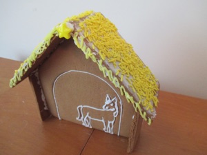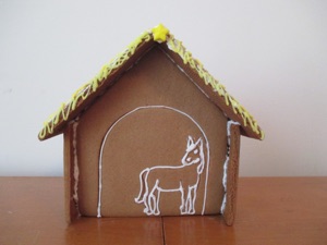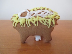 This barn consists of two house shapes, 2 side walls, and 2 roof shapes. This set has the outline of a donkey that you can draw over with icing. To color the roof, you can use yellow icing or sprinkles. Another option is putting a layer of icing, and before it dries, sprinkle on cereal such as cornflakes or crushed shredded wheat.