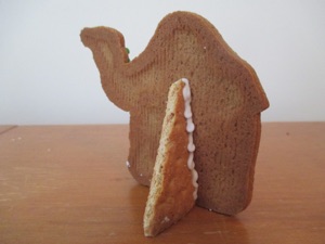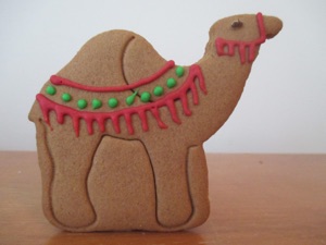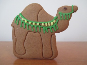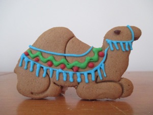 Decorate the camels with colored icing. Decorate each one in a different way to make it more interesting. Draw a half circle for the saddle, and a line around the neck and nose for the bridle. Then make lines coming down to look like tassels.