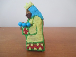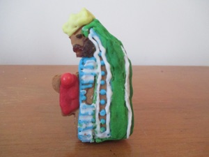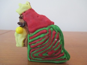 Decorate the wisemen with colored icing. Beards help them look like men. Multiple colors make them look more interesting. Here a crown over the head scarf distinguishes them from Joseph (and shepherds if they have them.) Use candy to decorate their gifts.