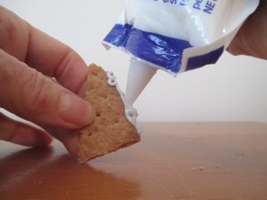 Put the pieces together with royal icing, which dries quickly and hard. To keep the pieces together until the icing dries, you can prop them up with heavy objects such as mugs or cans next to each side.