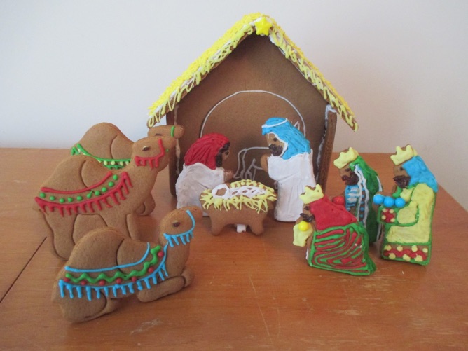Make an edible gingerbread Scene-- from scratch, or better yet, buy a pre-baked gingerbread nativity set, so all you have to do is decorate! This one was purchased at Walmart. If you can’t find a kit in a store nearby, you can still make one...it will just take a little more work. You can buy cookie cutters and pre-baked sets on-line through Amazon. Or download my paper pattern that you can cut out, then use as a guide to cut out the gingerbread shapes that you make from scratch.