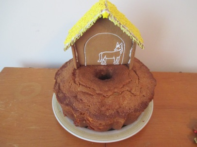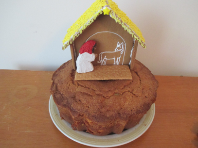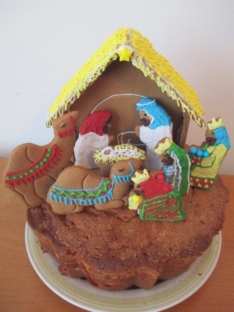 If you are going to feed a crowd, you may want to put the nativity scene on a cake. A sheet cake is a little bit bigger, so the scene would not be quite as crowded as the one shown here. If you do put the scene on top of a cake, put the figures on shortly before serving it because the moisture of the cake softens the cookies, so they may fall apart if you put them on too soon.