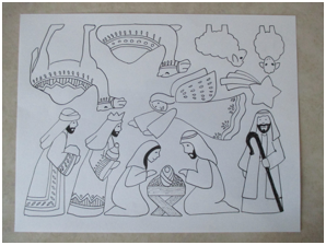 Decorate the Mary, Joseph and baby Jesus in the manger. Make the head scarves a different color from the clothing, or it will be hard to figure out what they are. Hair on Mary and a beard on Joseph make them easy to distinguish. Draw a circle for the baby’s face, and white for the swaddling clothes, and yellow “straw” around the baby.