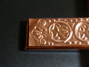 This design looks complicated, but is actually fairly simple--it is the same design repeated over and over. There are 9 circles down the vertical piece, and 2 circles on each side arm (see the copper on the right arm that has not yet been embossed.)