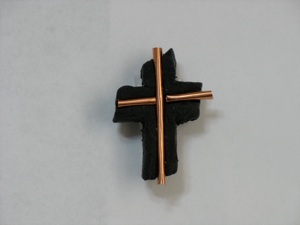 Copper sheeting is quite soft and malleable, so it is a easy to shape into crafts. You can buy it at craft stores, but you can buy it much cheaper at a dollar store or gardening center for keeping slugs off plants (see photo on right.) You can use toothpicks or dull pencils to emboss designs. The designs shown here are all crosses, but any design can be embossed. You can make small projects that are finished quite quickly, such as the cross on the left, or much bigger projects that can be attached to a larger base, such as the cross in the middle, or even a clock frame (view clock craft.) You can roll small strips of copper over a toothpick to form copper tubes, and add it to other materials, such as clay like the cross shown in the photograph on the right. Copper does turn brown over time, so it is important to paint the finished project with lacquer or gesso (a clear liquid like paint that dries clear) to protect it from the air.