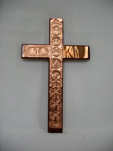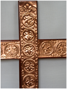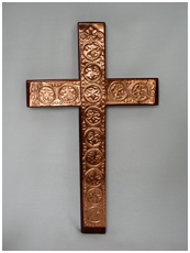 Glue the decorated copper strips to the cross, then coat it with lacquer, varnish, gesso, or modge-podge (used for decopage) to keep it from turning brown like copper coins.