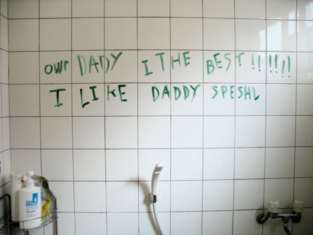 Write a message on the tile in the shower with white board marker, or window chalk. They both wash right off.