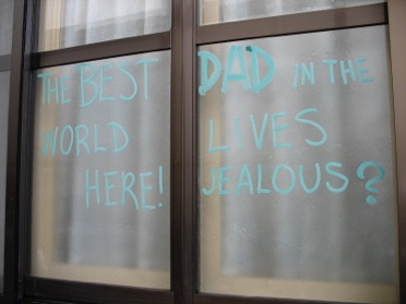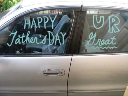 Buy one of those sports booster flags that you roll into the car window (sometimes sold at dollar stores) and change it to a Father’s Day message, and put it on the car window. If you can’t find one of those, write a message onto a plastic triangle, and tie it to the car antenna. It will flap in the wind, and look very presidential.
