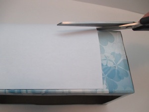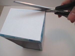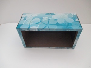 If you don’t have a tissue box either, any empty cardboard box big enough to hold a photo will work. Just glue the open end shut. Cover it with colored paper such as wrapping paper. Then cut an opening in the front of the box. Finish making the “frame” as instructed above.