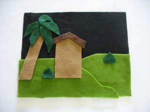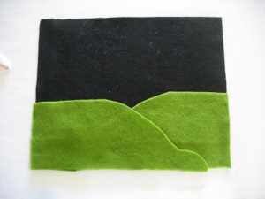 Make the scene into a large banner by adding dowels to the top and bottom of the background, and glue the figures onto it. The size is determined by how many figures you want to bother cutting out, OR how big a piece of felt you are able to buy, OR how big your wall space is. Actually, since you glue the pieces to the background for a banner, the background fabric can be any type of fabric. You may want to hem raw edges so they look finished, and don’t ravel over time. For felt, this is not necessary.