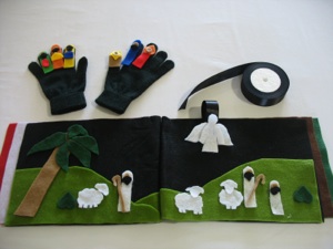 Make an interactive felt Christmas book to use with your toddler. Plan the pages on paper, then make them out of felt. Keep it simple with just 3 scenes--Jesus’ birth, the angel appears to the shepherds, and the wise men give gifts to Jesus. Or make it more elaborate to include the angel appearing to Mary, then to Joseph, and Jesus dedicated at the temple, etc. Then make some of the figures into finger puppets instead of gluing them to the page. Your child can walk Mary and Joseph through the story.