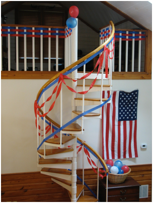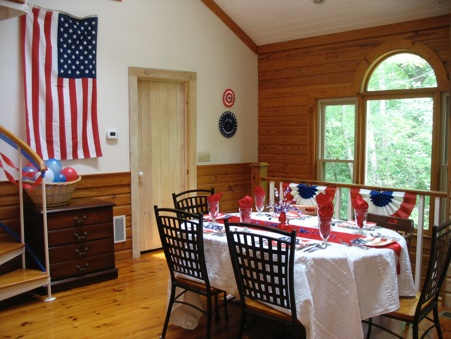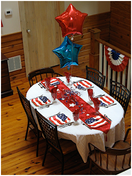 Streamers are another inexpensive way to splash lots of color around the room. Balloons can repeat the colors and add to the festive atmosphere. However, you can spend a lot of time blowing up balloons, so using them strategically can give those splashes of color without taking all day to fill them. Here are a few ideas--put some at the top and bottom of a staircase, put them on sticks as a bouquet, or put them in a bowl as a centerpiece on the table, or in a basket next to a large flag.
