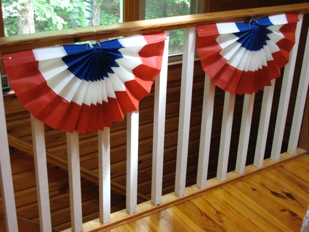 Buntings are quintessential decorations for this holiday, and they can decorate large spaces quickly. However, they are usually pretty pricey, and since they are often used them in multiples (under each window, or along a long railing), can get expensive. Try to look around for places that don’t need a dozen buntings to fill the space. The ones pictured here were purchased at a dollar store, but even so, they can add up if you decorate a long railing on a porch or stairway. In the photo, the banister is quite short, so only 2 were needed to decorate it. I hung the buntings by tying thread through the grommets, and taped the thread loops to the railing. Twist ties or wire to wrap through the grommets and around the banister would work, too.