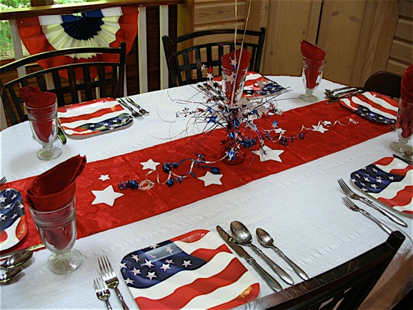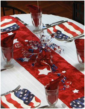 If you want to set a spectacular table for your fourth of July celebration, you don’t have to buy a red, white and blue tablecloth that only gets used once a year. Start with a white tablecloth--if you don’t have one, use a bed sheet. Fold it in half, if you need to make it fit. Dress it up a with a red table runner. If you skip the white tablecloth, the red runner lacks contrast against the bare table, so the red, white and blue color scheme gets lost. If you can find a red runner at a dollar store, buy it! Do be careful when you iron it, though, because a hot iron can melt it!! If you can’t buy a runner, sew your own, or use red paper to make one. A blue table runner works, too, but a red one is more versatile, because it can also be used for Christmas and Valentine’s Day. Decorate the table runner with paper star cut-outs and curling ribbon. If you need a star pattern here are 3 different ways to get one--1)Use star cookie cutters as patterns, or 2) use your computer to make and print out stars of different sizes, or 3) follow my instructions to cut out stars by making a few folds in a piece of paper, and making one cut, then open up a star. If you use colored paper for the runner and/or stars, test the paper to see if it bleeds when it gets wet--to do this, wet a small piece of colored paper, and put it on a white paper towel. If the color doesn’t transfer, you shouldn’t have to worry if someone spills something at the dinner table.