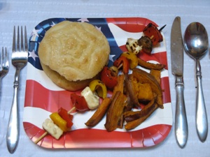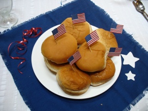 Even food can be dressed up for the fourth. If you are a foodie, and make your own hamburger buns, you can press graduated star cookie cutters into the dough before it rises (this photo is thanks to my daughter, the gourmet cook!) The rest of us can just whack a tiny flag into the top of store-bought buns, or what ever food you are serving. Look for tiny flags on toothpicks in grocery stores, and dollar stores. If you can’t find them, you can make your own. Google search for American flags, and print out a page of tiny flags. Glue them back to back over toothpicks.