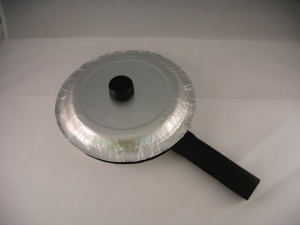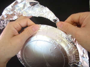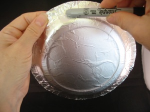 Rub glue (glue stick works fine) on the back of one of the paper plates, and press the foil onto the back of the plate. If you can’t find black paper plates, cover a white plate with aluminum foil to the top and bottom of the plate.)