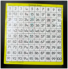 2.Count backwards : This activity helps with subtraction. Start with counting down from 10, like a rocket launch--you could do it for waiting for red lights--see how close you can get the light turning green as you hit 0. When your kids get good at that, count down from 20, 50 and 100. Once they can count well in unison, at random times, stop counting, and let the next person pick up where you left off. If your child has trouble with this, make sure he has a 100’s chart to look at, then try again without it once he catches on. The chart shown in the photo above can be written on with dry erase markers. You can make your own hundreds chart on the computer, print it out and cover it with contact paper, or buy one at a school supply store.