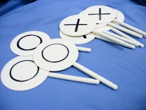 Many hundred yen stores sell these--10 to a pack for paper, and 3 to a pack for plastic. Make your own by writing O (for correct statements) on one side and X (for incorrect statements) on the other side of card stock or poster board and tape to unsharpened pencils or disposable chopsticks.