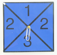 3.Poke a hole in the middle and push a paper clip, safety pin, or cardboard arrow onto a brad and through the board. Make sure the brad is loose enough for the spinner to spin freely.