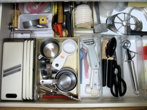 Organize it----figure out ways to store things that makes it simple to find them, and simple to put them away. If the place an item belongs is in the back of the closet, it will be left out until a more convenient time to get everything out of the way to put it where it belongs. If lots of things are stored on top of each other, it is bothersome to get anything out. It is far better to get shelves or a set of drawers so that each item is easy to retrieve. If there are dividers in a drawer, it is much easier to find the item you want. than if they are all jumbled together. Most hundred yen stores sell items that can be used as drawer dividers, but if you can’t afford that, use things that you usually throw away--cereal boxes, kleenex boxes, square pet bottles, margarine tubs, etc.