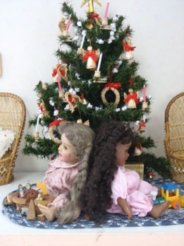 Girls who play with dolls love to decorate for Christmas so they can pretend their dolls are celebrating Christmas, too. This dollar store tree is just right for these dolls. Dollar stores also sell plenty of decorations that are just the right size for small trees. I also made “popcorn” strands from air drying clay, such as hearty. I glued tiny wooden candle cups to tiny wooden clothespins, then put birthday candles in them (but never ever light real candles--it is too dangerous!!
