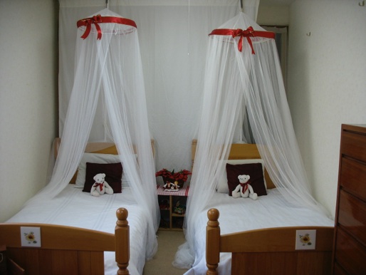The net canopies are hung from tension poles rather than a hook in the ceiling. Red bows and pillows have been added to continue the red and white theme.