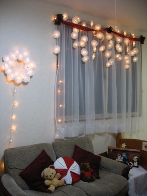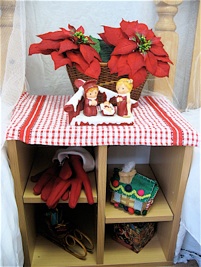 This room is decorated in red and white, the color of candy canes. I hung strings of white beads and red hearts from hooks on the ceiling. The window is sort of a bay window, so there is space to decorate. The 2 angel mobiles and glass nativity scene depict the birth of Jesus, the reason for this holiday. If you like the look of the angels, but can’t find angel mobiles, make your own--buy inexpensive angel tree ornaments and string them at different lengths on a ring or disc, such as an embroidery hoop. Sometimes dollar stores sell the clear glass nativity sets.
