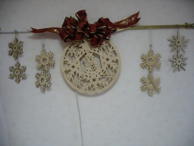 This wooden German light, with a snowman and snowflakes, Is a fun wreath alternative. When the light is on, it gives a warm glow. (Unfortunately, when I take a photo of it with the light on, the shadows make you feel like you are seeing double!) I discovered similar wooden snowflakes at a dollar store, and hung them from a dowel along with the wooden “wreath.”