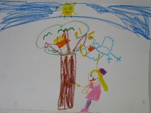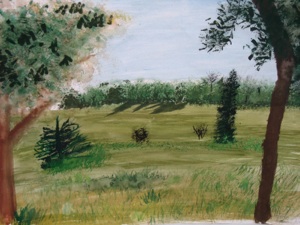 Your child’s age will greatly influence how a finished scene will look. The picture on the left was painted by a child who is 12 or 13. The picture on the right was colored by a child who is 4 or 5. Don’t expect a 5 year old to be able to paint like a 12 year old. However, with a little coaching, even a young child can paint some pretty good pictures. Start by painting the sky blue, and the grass green. Next add some bushes by dipping pieces of sponge or bits of rag in green paint, and then dab on bushes at the edge of the green grass. Using several shades of green makes the scene look more realistic. Finally, paint on the trees--see tips on the right.