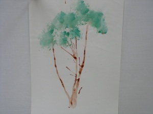 Here is an easy way to paint trees, even for a 4 or 5 year old. Put a blob of brown paint on the paper where you want the base of the tree to be--presumably toward the bottom of the page. Then blow through a plastic drinking straw to push the paint up to form the trunk and branches. If you want leaves, let the brown paint dry, then dab green paint on with cotton balls or bits of old sponge. Another way to make leaves is to tear off bits of green tissue paper and glue them to the branches of the trees.