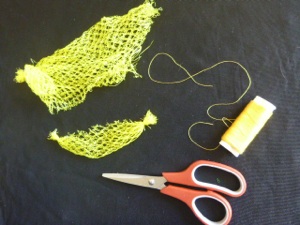 Cut the net bag to fit between the 2 trees. Tie both ends of the net with thread