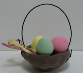 6. Once the basket has dried, poke the handle through the sides and bend the sides up. Fill with several clay eggs